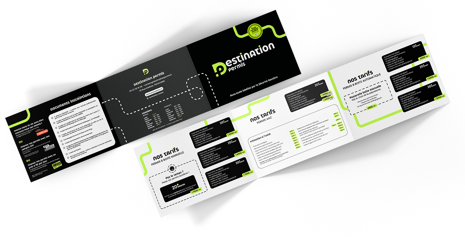 Destination Permis est une auto-école parisienne qui souhaite moderniser son image tout en gardant une approche accessible et rassurante. L’identité repose sur un symbole fort, la lettre D traversée d’un chemin, clin d’œil au slogan Direction les routes. L’univers visuel joue avec une ligne graphique récurrente, évoquant la progression et le mouvement, dans une palette sobre mêlant vert, noir et blanc. Une image de marque pensée pour guider, rassurer et donner envie d’avancer.
