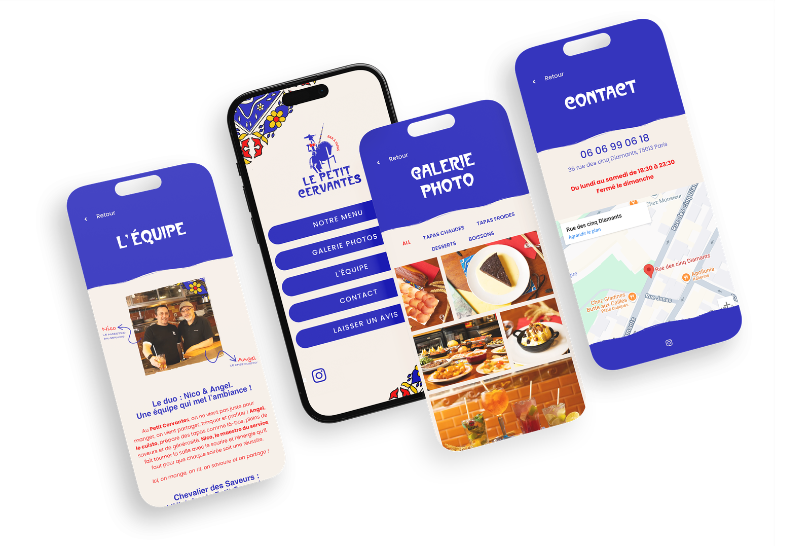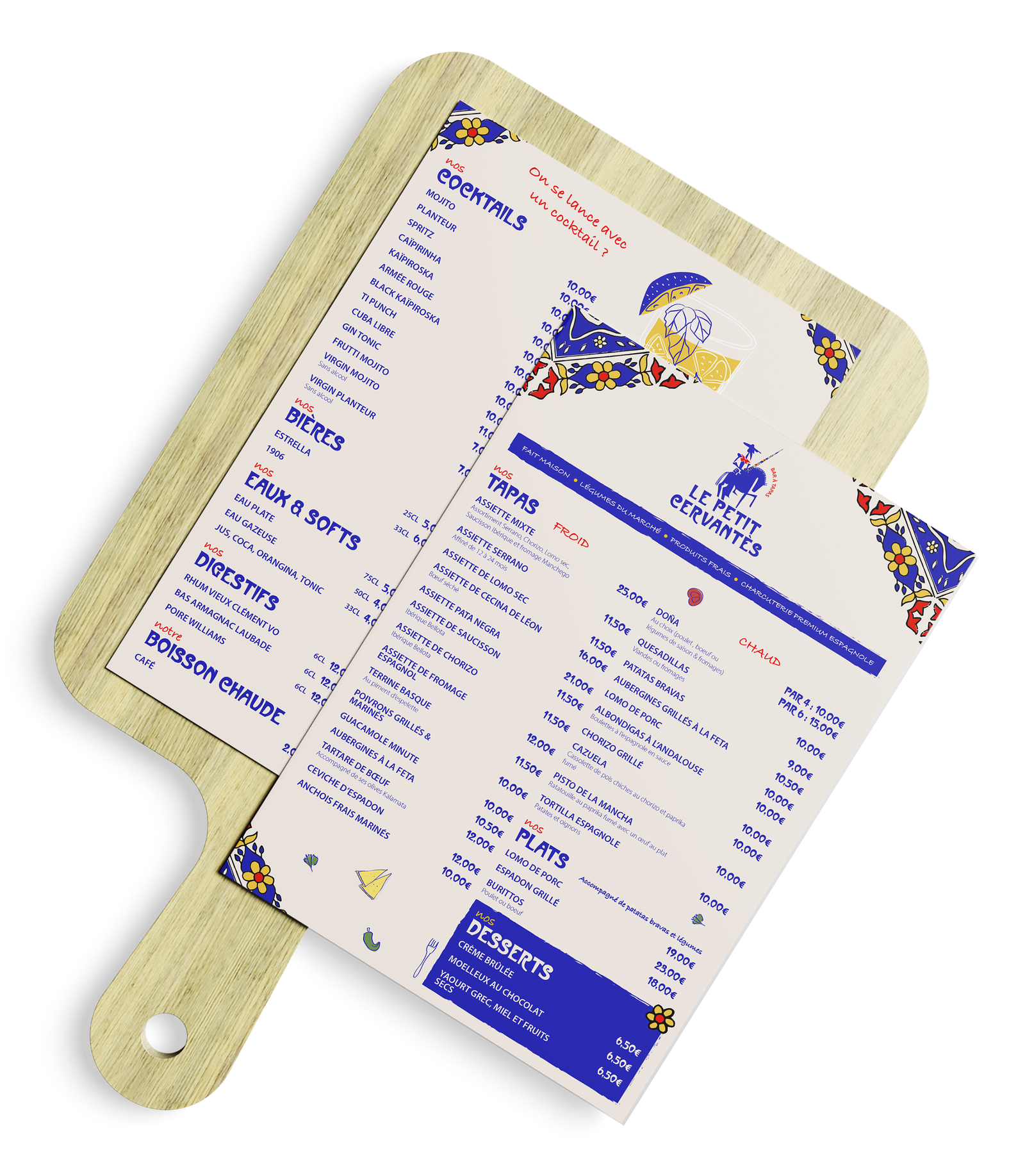 Le Petit Cervantes est un bar à tapas aux influences espagnoles fortes, où l’univers de Don Quichotte rencontre une ambiance colorée et conviviale. La refonte de son identité visuelle s’est construite en écho à la décoration intérieure du lieu, mêlant mosaïques, teintes chaudes et références culturelles. Une nouvelle image a été pensée pour traduire cette atmosphère tout en renforçant la cohérence de la marque sur l’ensemble de ses supports, du lieu physique jusqu’au digital.
