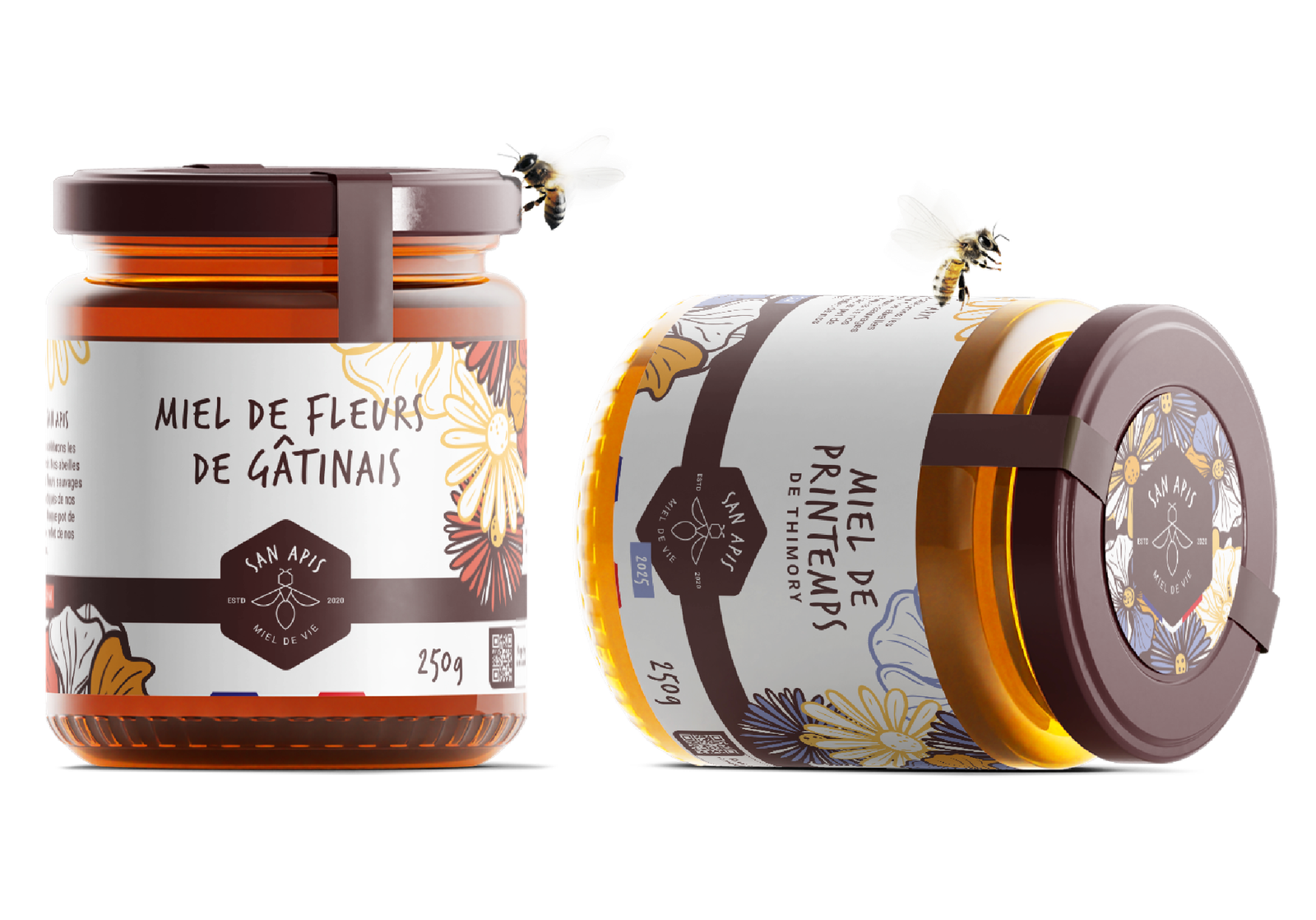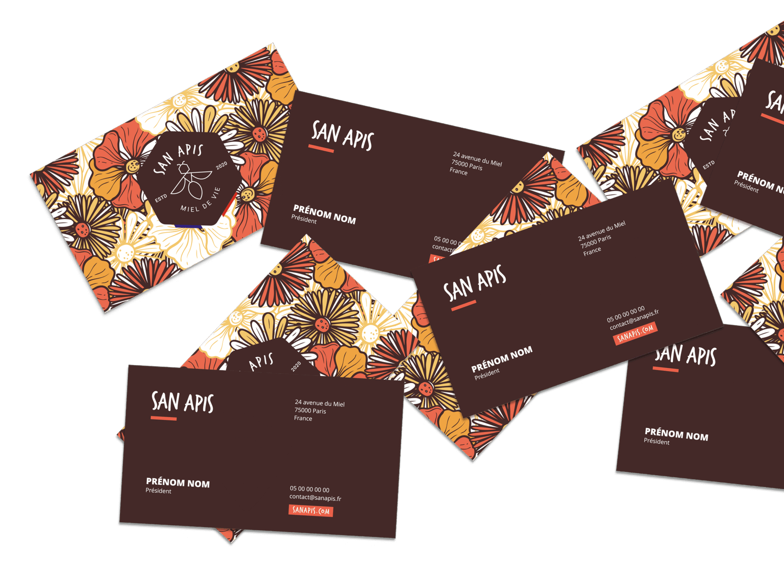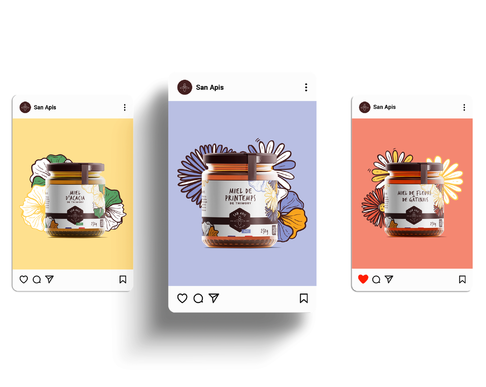 San Apis est une marque de miel artisanal qui valorise le savoir-faire local et la diversité florale. L’identité visuelle s’inspire des fleurs mellifères, avec une palette colorée et naturelle qui évoque la richesse du terroir. L’univers graphique a été décliné sur plusieurs supports print et digitaux afin d’installer une image de marque cohérente, chaleureuse et facilement identifiable.